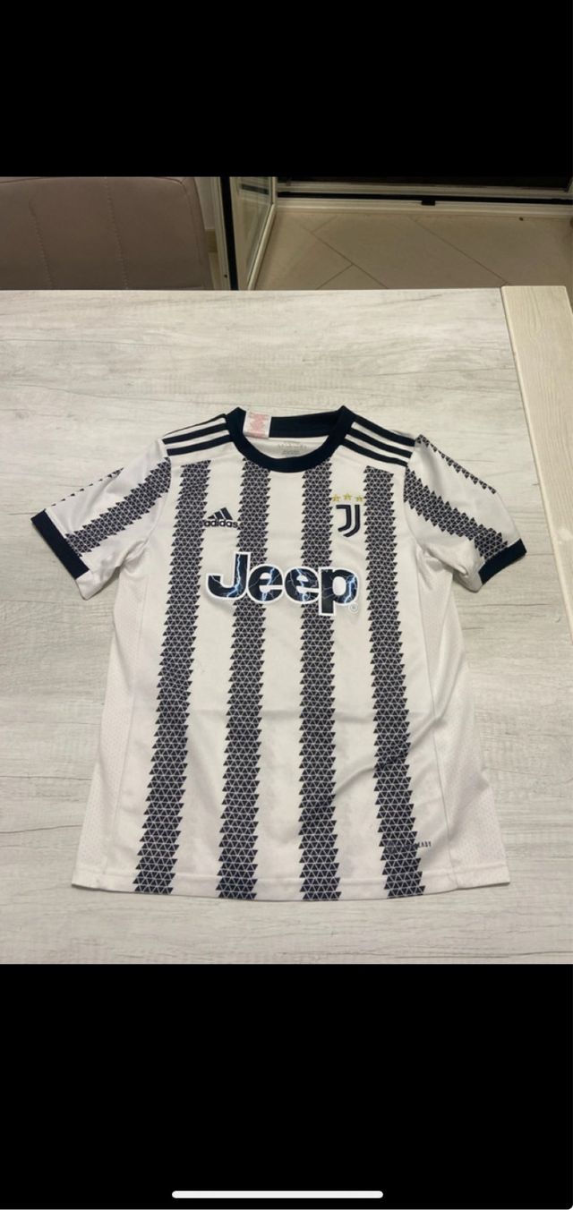 Maglia da calcio Juventus per bambini, taglia 12 anni. - Design a strisce bianche e nere. - Logo Adidas e stemma Juventus sul petto. - Sponsor Jeep sul davanti.