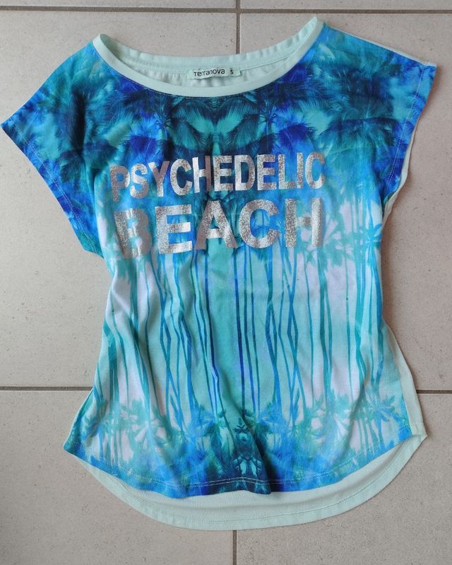 Bellissima maglia estiva Terranova, taglia S, con stampa psichedelica di palme e scritta "Psychedelic Beach". - Perfetta per l'estate. - Colori vivaci e brillanti. - Ottime condizioni.