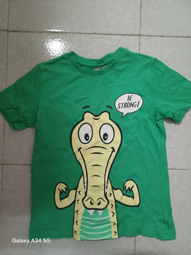 Dettagli del prodottoMaglietta a maniche corte per bambino, taglia 5-6 anni. Colore verde brillante con una simpatica stampa di un coccodrillo che mostra i muscoli e la scritta BE STRONG!.