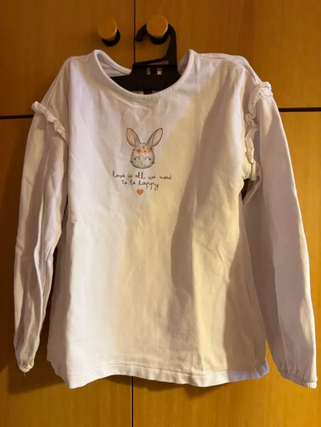 Dettagli del prodottoMaglietta bianca a maniche lunghe con stampa di un coniglietto e scritta love is all we need to be happy.