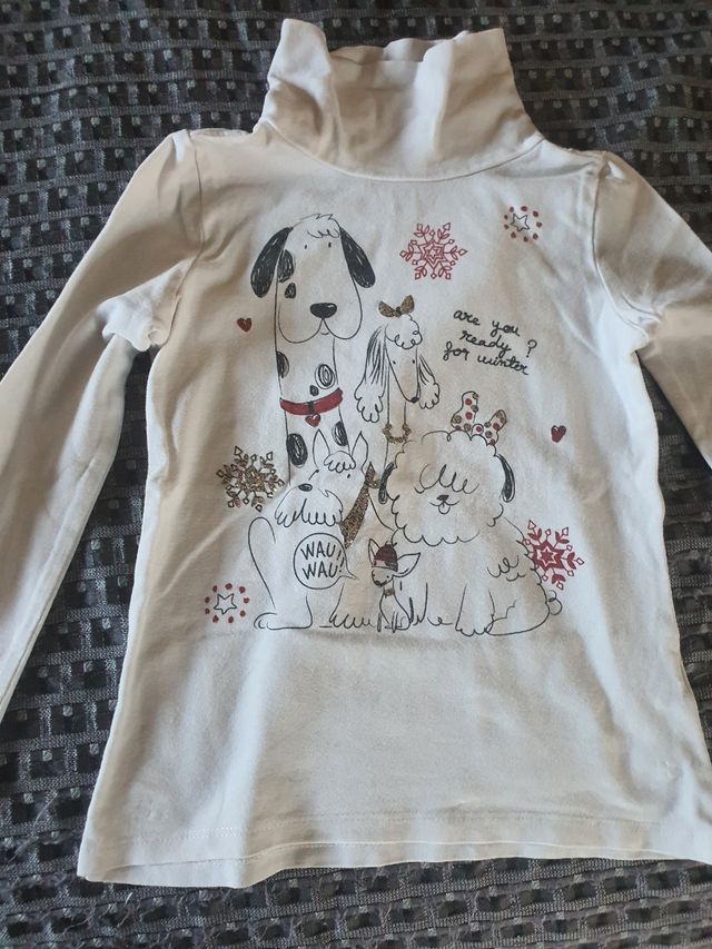 Dettagli del prodottoMaglietta bianca a manica lunga per bambina, con un simpatico disegno di cani e fiocchi di neve.