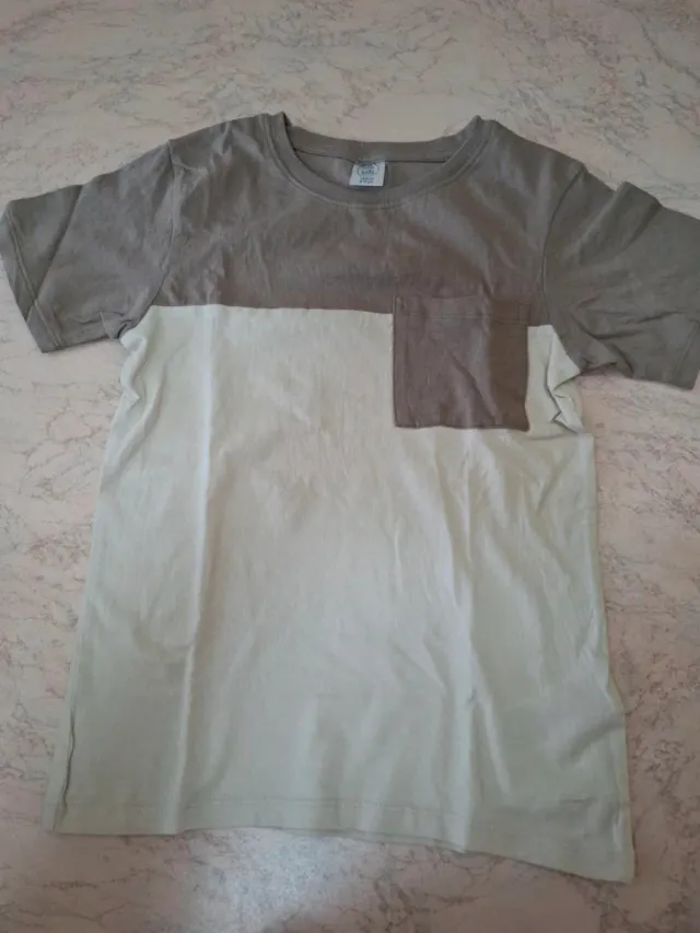 Maglietta a maniche corte per bambino. - Colore grigio e bianco. - Taschino applicato sul petto.