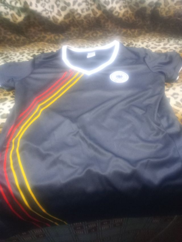 Maglietta da calcio con design ispirato alla Germania. Taglia 44 - Colore nero. - Dettagli a strisce rosse, gialle e nere. - Stemma sul petto.
