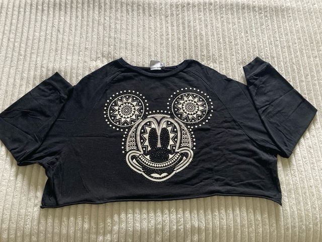 Maglietta nera a maniche lunghe con stampa di Mickey Mouse. - Stampa di Mickey Mouse con dettagli etnici. - Taglio corto. - Maniche lunghe raglan.