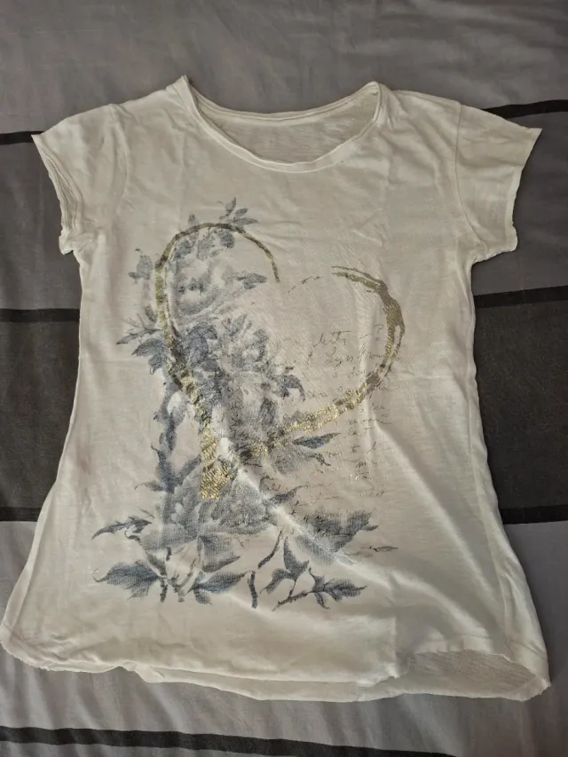 Maglietta da donna con una stampa decorativa sul davanti.
