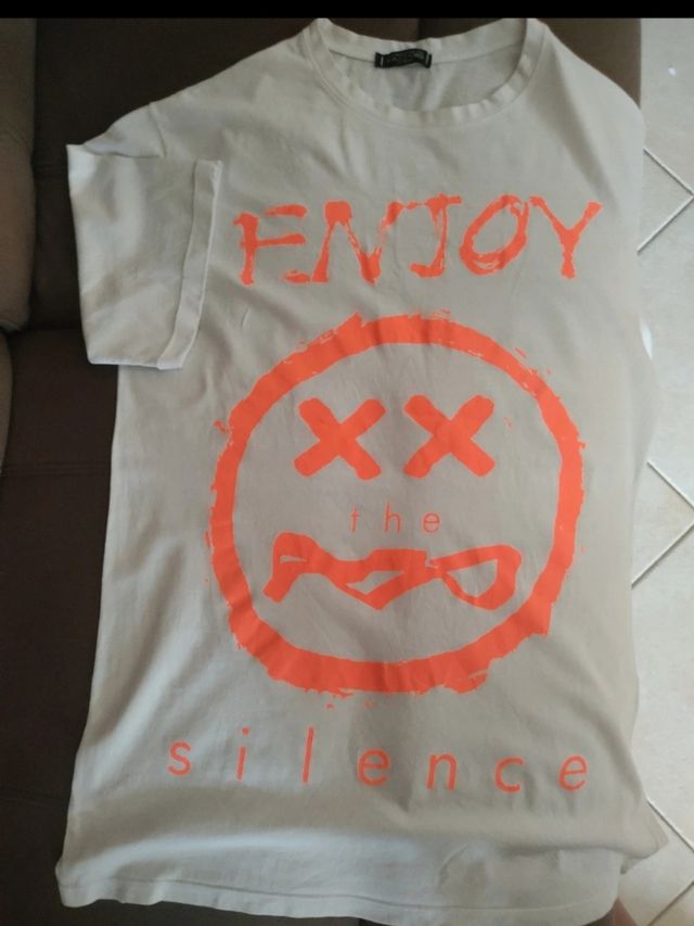Maglietta bianca da ragazzo con stampa Enjoy the silence e faccina.+ Pantaloncini - Stampa grafica arancione. - Girocollo. - Maniche corte.