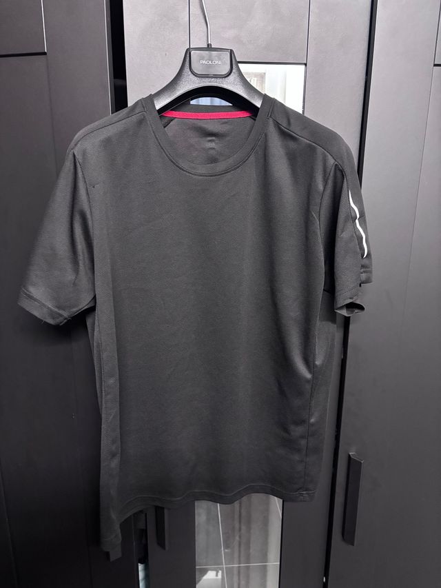 Dettagli del prodottoMaglietta sportiva di colore nero, taglia L. Presenta un dettaglio a contrasto sul collo e un motivo grafico sulla manica.