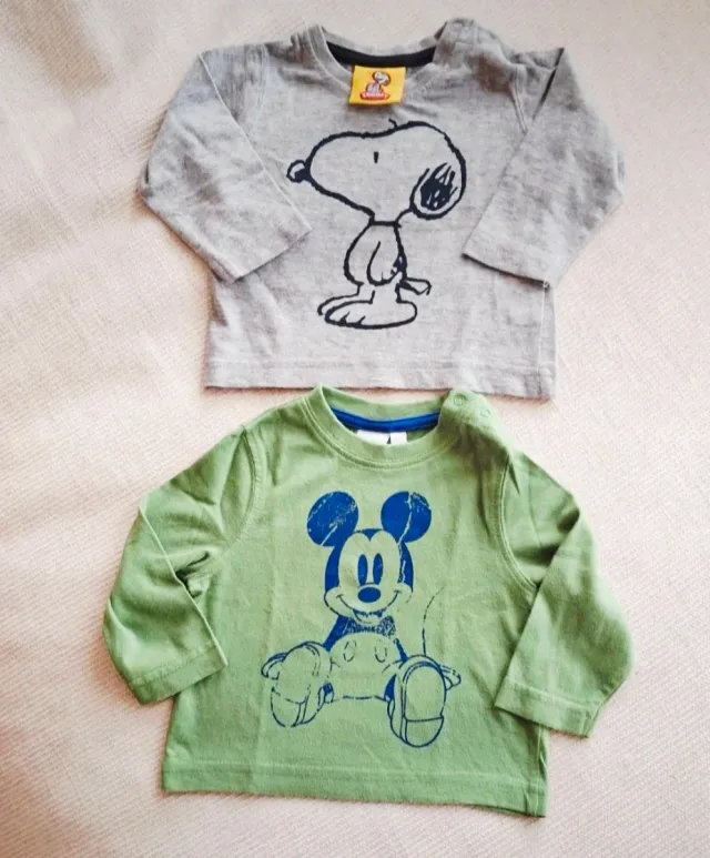 Set di due magliette a manica lunga per neonato. - Una maglietta grigia con stampa di Snoopy. - Una maglietta verde con stampa di Topolino.