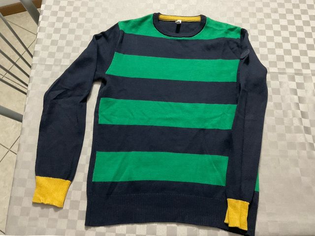Bellissimo maglioncino a righe per bambino, perfetto per l'autunno. - Colore blu scuro e verde. - Maniche lunghe. - Dettagli gialli sui polsini. - Ottimo stato.