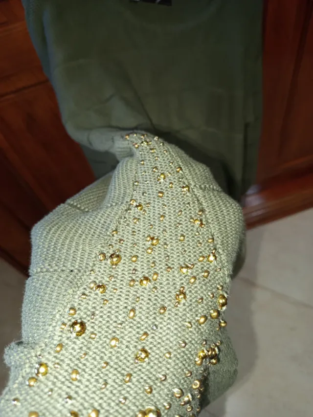 Maglioncino con dettagli di perline dorate sui lati. Un capo versatile e alla moda.