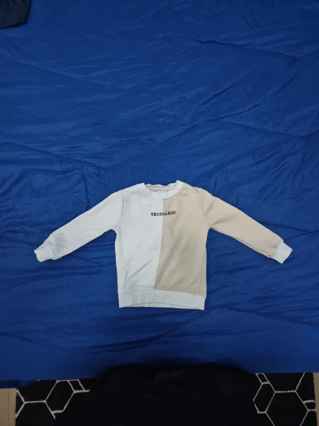 Dettagli del prodottoMaglioncino Trussardi per bambino, taglia 18 mesi. Presenta un design bicolore con il logo TRUSSARDI stampato sul davanti.