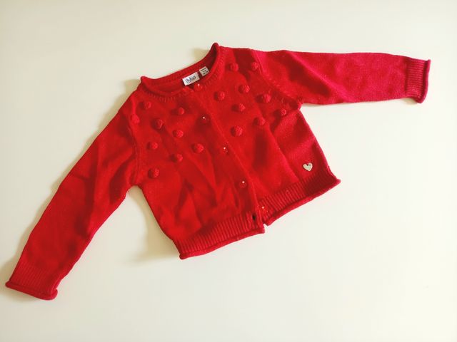 Dettagli del prodottoMaglione bambina, rosso. Chiusura a bottoni con brillantino. Ciondolino a cuore con brillantino sul frontale. Taglia 74 cm, 9-12 mesi. Blukids. Come nuovo Misure del prodotto