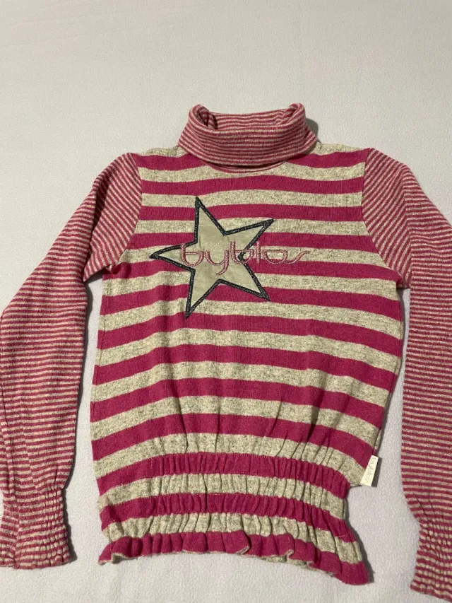 Dettagli del prodottoMaglioncino a collo alto per bambina, con fantasia a righe fucsia e beige. Presenta una stella applicata sul davanti con la scritta Byblos.