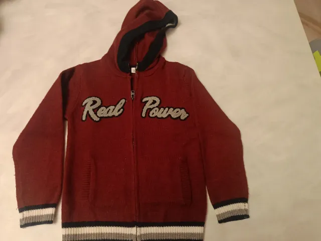 Dettagli del prodottoMaglione con cappuccio e zip per bambino, taglia 7-8 anni. Colore bordeaux con scritte Real Power sul petto e bordi a righe su maniche e fondo.
