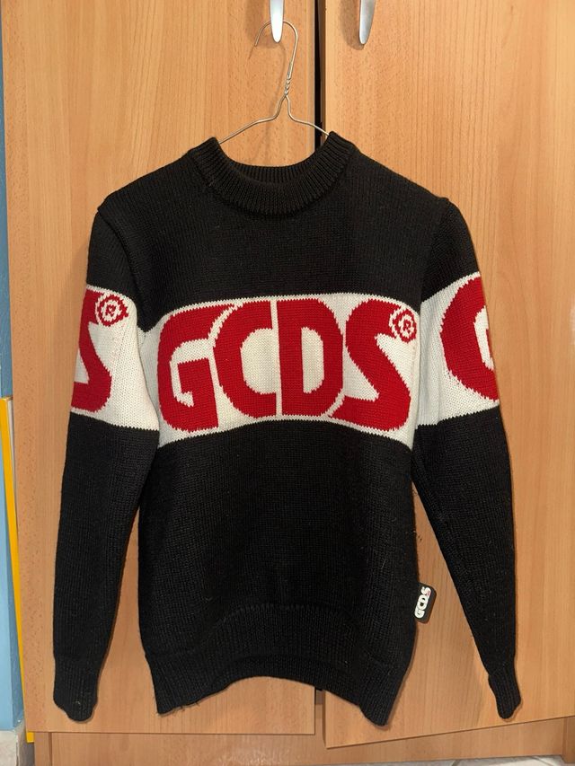 Dettagli del prodottoMaglione GCDS con un design a blocchi di colore distintivo. Presenta il logo GCDS in rosso e bianco sul davanti.