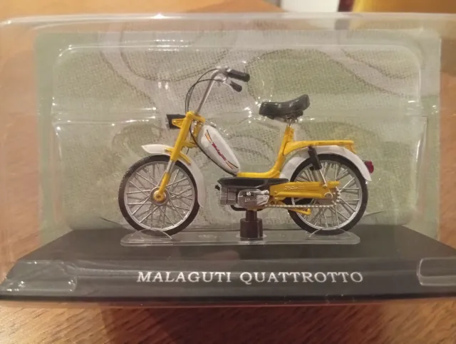Modellino del Malaguti Quattrotto del 1980. - Scala 1/18 - Dettagli fedeli all'originale. - Base espositiva inclusa. - Colore giallo e bianco