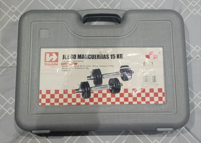 Kit da palestra con manubri da 15 kg. 2 barre, 12 dischi da 1 kg, 4 chiusure. Sono inclusi altri 4 chiusure.