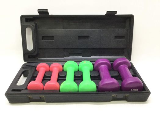 Dettagli del prodottoSet di manubri di diversi colori per l'allenamento a casa. Include una custodia per riporli.