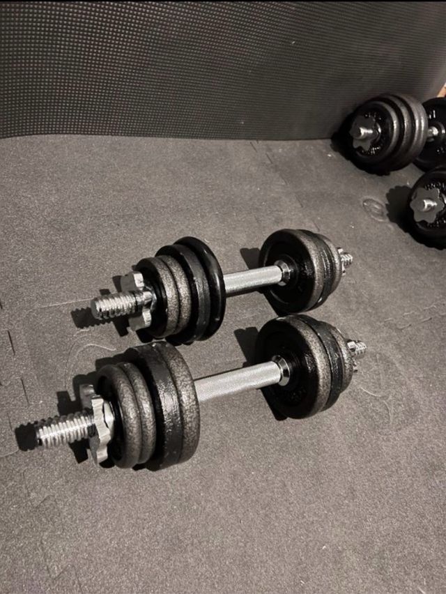 Dettagli del prodottoCoppia di manubri in ferro con dischi regolabili. 6,5 kg ciascuno (13 kg in totale).