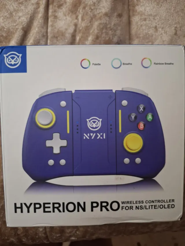 Dettagli del prodottoController wireless Hyperion Pro in colore blu. Utilizzato solo per verificare il funzionamento. Compatibile con Nintendo Switch, Switch Lite e Switch OLED. Design ergonomico per una maggiore comodità. Include funzioni di palette, respirazione e arcobaleno. La descrizione è stata tradotta automaticamente.