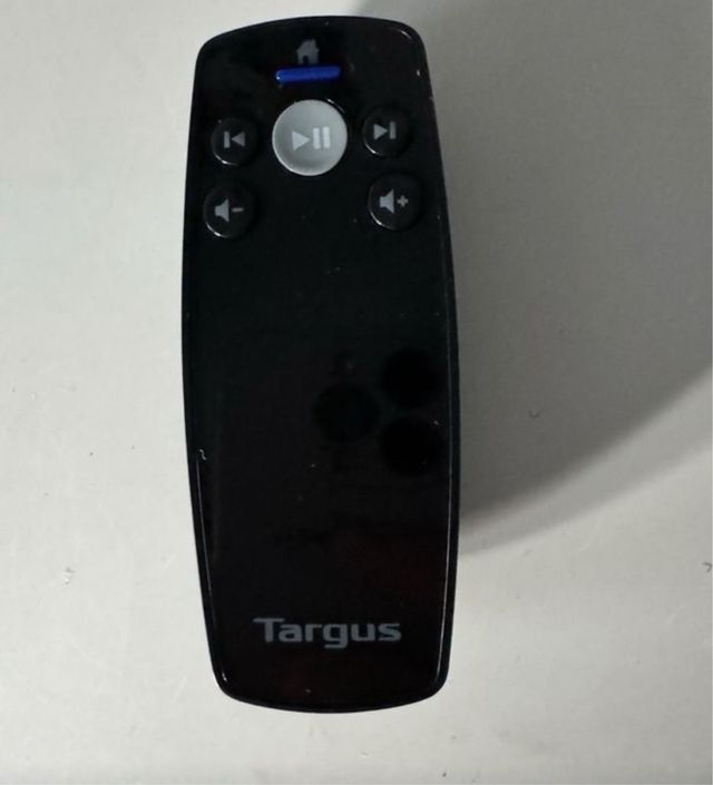 Dettagli del prodottoComando a distanza via Bluetooth per presentazioni del marchio Targus. Progettato per facilitare il controllo delle tue diapositive. - Pulsante play/pause. - Pulsanti avanti e indietro. - Controllo del volume. - Pulsante di avvio. La descrizione è stata tradotta automaticamente.