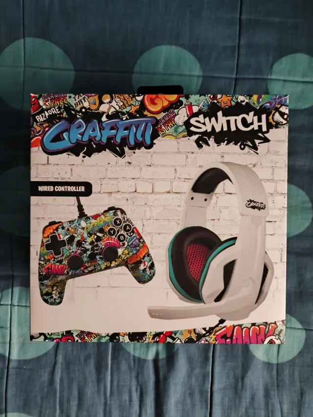 Dettagli del prodottoPacchetto di accessori con design graffiti per Nintendo Switch. - Controller con cavo. - Cuffie con microfono. La descrizione è stata tradotta automaticamente.