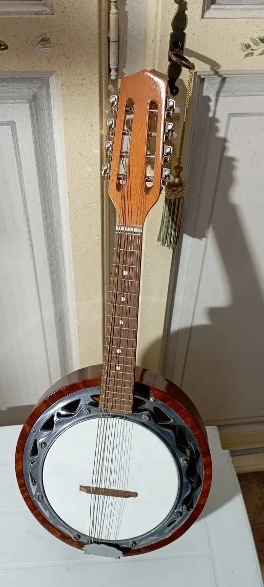 Dettagli del prodottoStrumento musicale vintage con cassa armonica rotonda e manico lungo.