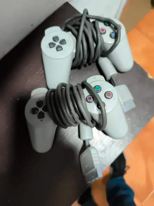 Due controller originali per PlayStation 1 (PS1). Colore grigio. Connessione via cavo.