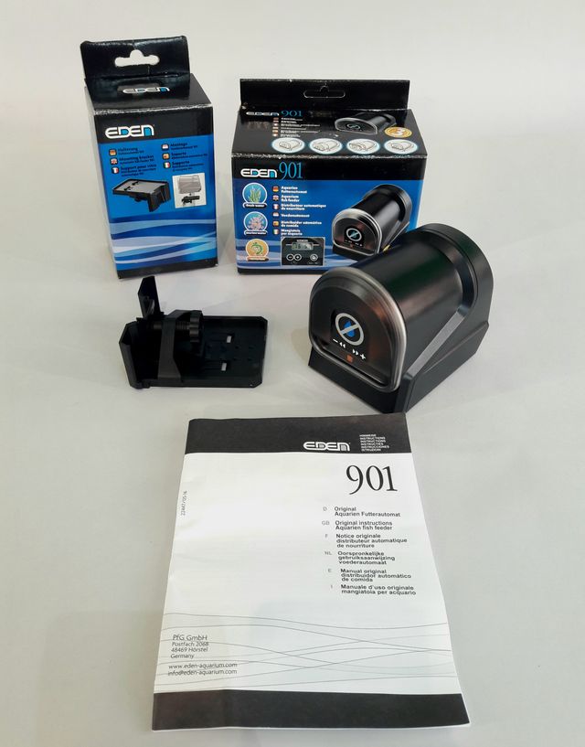 Dettagli del prodottoMangiatoia automatica Eden 901: nuova tecnologia con vano cibo estendibile adattabile su ogni acquario + supporto bordo vasca. La vendita comprende quindi entrambi gli articoli (il supporto bordo vasca, qui compreso nel prezzo, è solitamente un accessorio opzionale). Nuovo in perfette condizioni estetiche e di funzionamento. Sono inclusi gli imballi originali e le istruzioni d'uso.