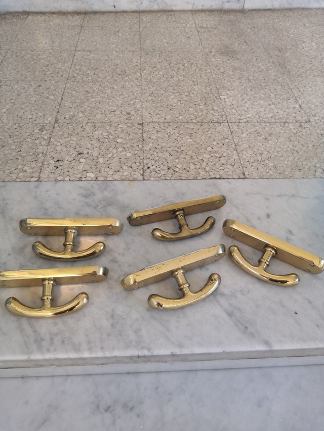 Dettagli del prodottoVendo un set di 5 maniglie per finestra in metallo dorato complete di parte interna e viti. Presentano qualche segno di usura come da foto