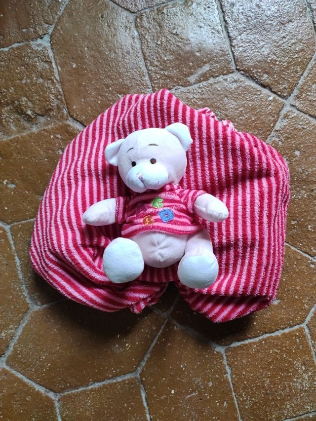 Dettagli del prodottoMorbida coperta a righe rosa/fucsia di 100x74 cm e orsacchiotto vestito con le stesse strisce di circa 20 cm.