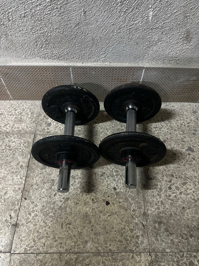 Coppia di manubri per pesistica. - Manubri con dischi in metallo nero. - Impugnatura in metallo cromato.