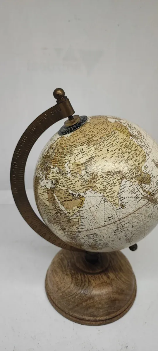 Mappamondo da tavolo in ottime condizioni. - Base in legno. - Arco in metallo con indicazioni. - Dettagli geografici chiari.