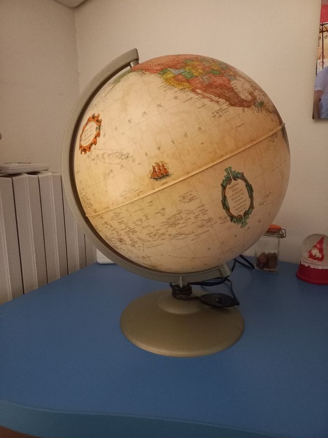 Mappamondo da tavolo con luce interna in stile antico ad alimentazione elettrica. Ottime condizioni, mai usato. Dimensioni: cm 39 x cm 55
