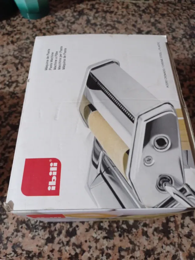 Dettagli del prodottoMacchina per fare pasta fresca a casa, marca IBILI. Realizzata in acciaio cromato e plastica. Include rulli per stendere l'impasto. Permette di regolare lo spessore della pasta. La descrizione è stata tradotta automaticamente.