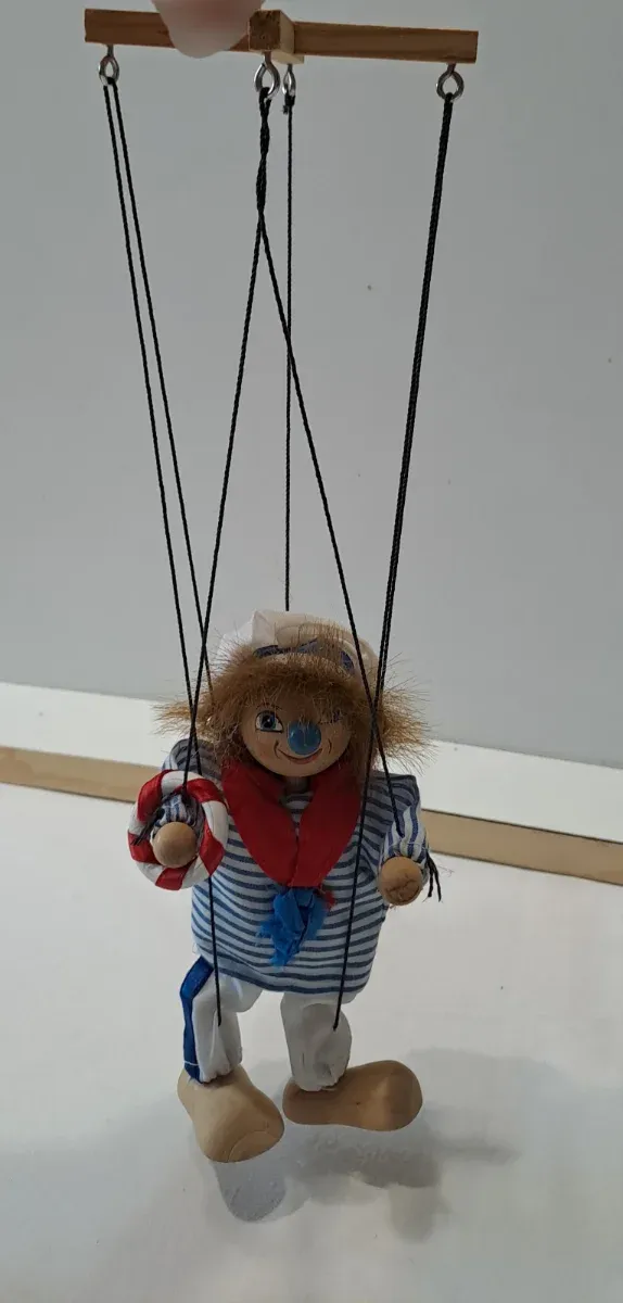 Marionetta marinaio da collezione con dettagli curati, realizzata con legno e tessuto. Altezza compresa di fili 30 cm Altezza solo marionetta 15,5 cm