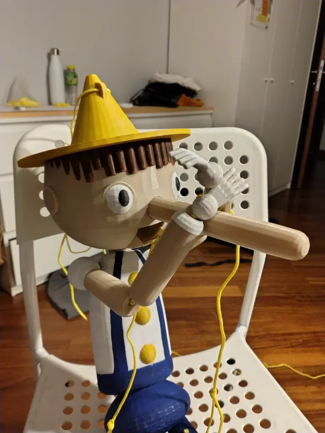 La marionetta è stata fatta realizzare tramite stampa 3D sulla base di un progetto originale e successivamente decorata a mano.