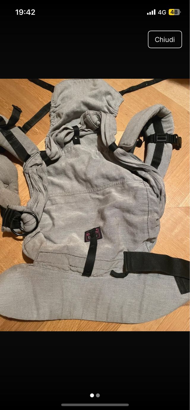 Marsupio ergonomico per bambini in età toddler. Realizzato in tessuto grigio melange. - Spallacci imbottiti. - Cintura regolabile. - Cappuccio integrato.