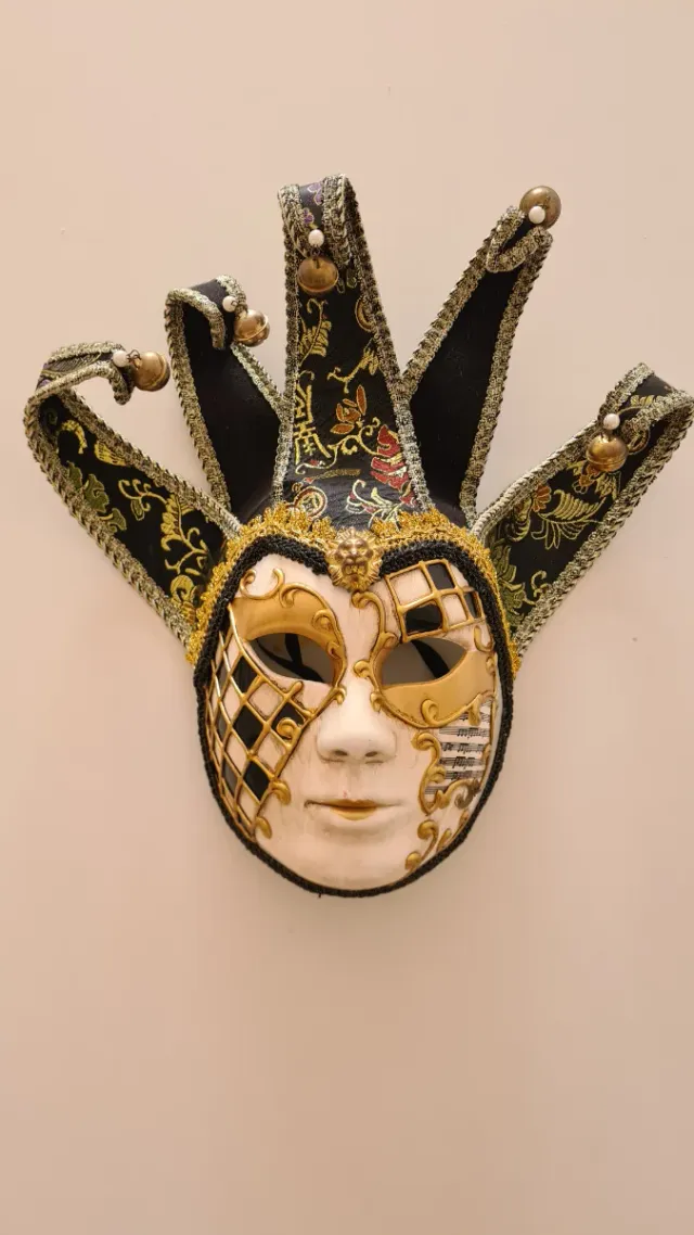 Dettagli del prodottoMaschera veneziana in stile giullare, realizzata con dettagli intricati.