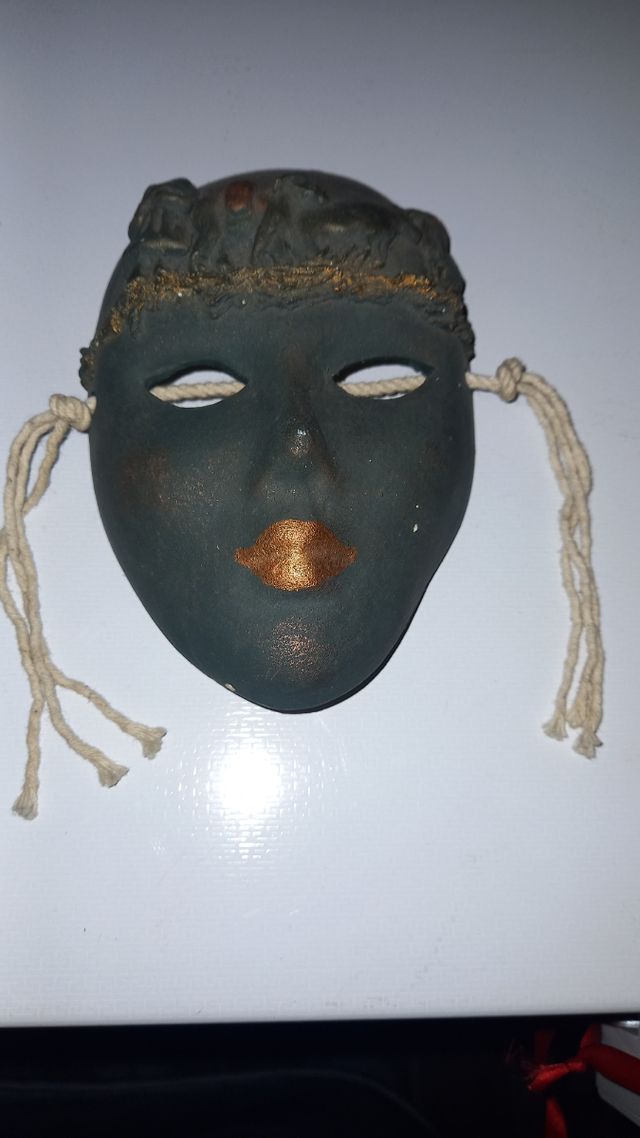 Maschera da appendere alla parere per amanti del genere. Disegno in rialzo nella parte superiore. color Verde scuro e oro.