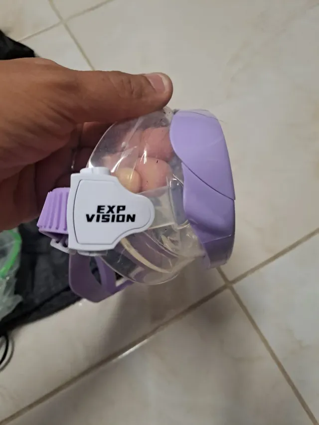 Maschera per immersioni con logo EXP VISION. - Lente trasparente. - Cinturino regolabile viola e bianco.