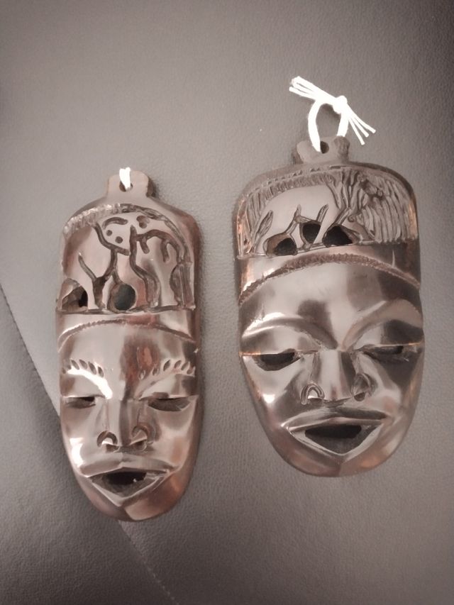 Dettagli del prodottoDue maschere artigianali, intagliate a mano, raffiguranti volti stilizzati. Sono realizzate in legno scuro e presentano dettagli intricati. Perfette per arredamento etnico o collezionismo. Lunghe circa 20 centimetri ed appendibili.