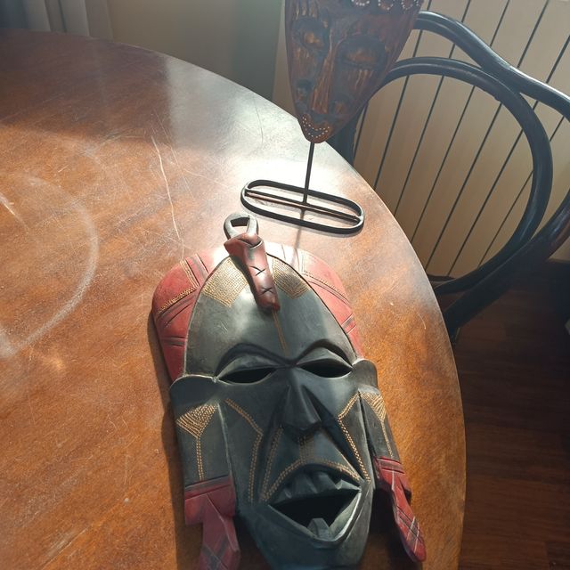 Due maschere in legno, una su base in ferro,l'altra più grande da appendere....come nuove
