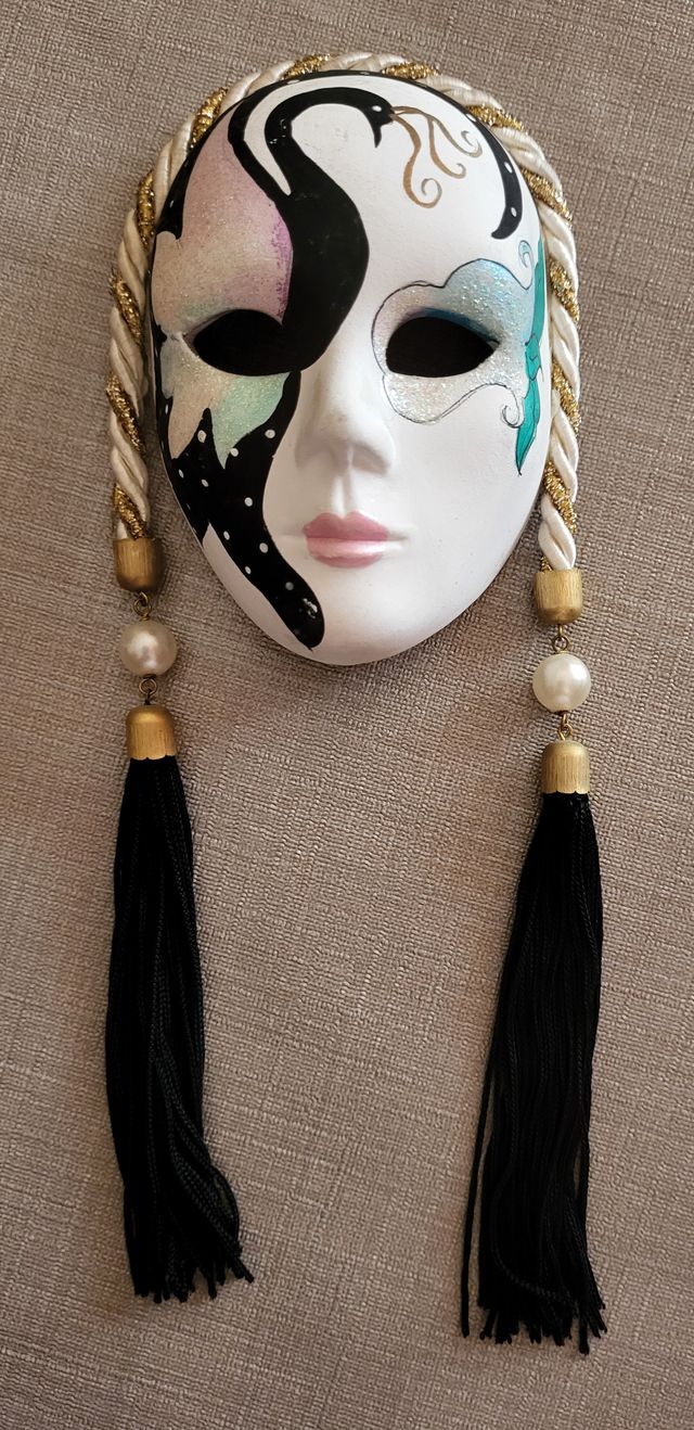 Dettagli del prodottoCoppia di mascherine veneziane dipinte a mano in ceramica, da appendere, ben tenute. Dimensioni: altezza cm 10,5 (cm 22 con frange) larghezza cm 8 profondita' cm 4,5.