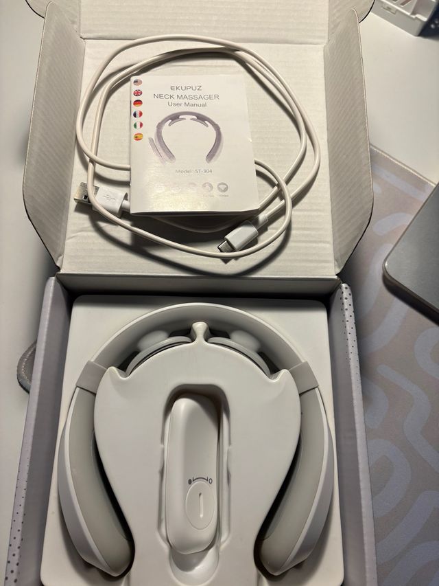 Massaggiatore cervicale EKUPUZ, modello ST-304. Include manuale utente e cavo di ricarica. - Design ergonomico. - Colore bianco e grigio.