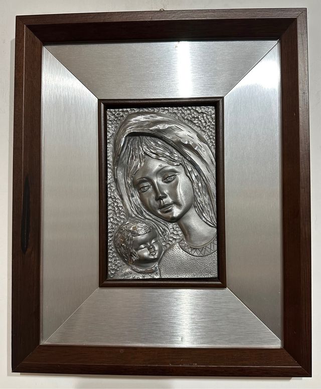 Dettagli del prodottoQuadro vintage raffigurante una maternità in peltro con sfondo in acciaio e cornice in legno. Il quadro si trova complessivamente in buono stato con qualche segno dovuto al tempo come da foto. Ha dimensioni 35,5 per 29 cm. Sarà accuratamente imballato e spedito.