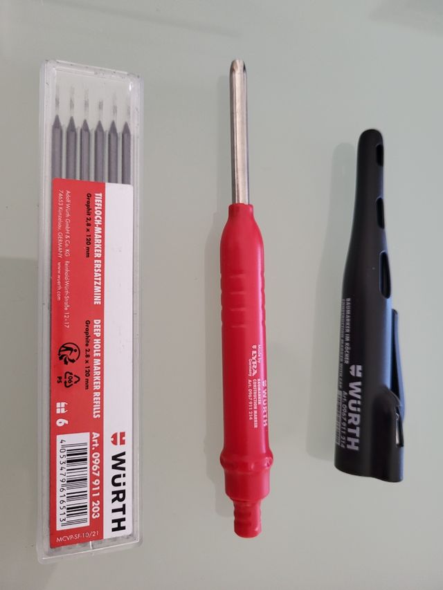 Matita per fori profondi con supporto da cintura con temperamatita incorporato più una confezione di mine ricambio. Ottimo per lavoro o bricolage tutto nuovo.