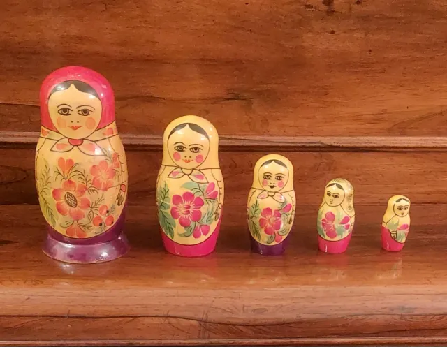 Set di 5 matrioske russe dipinte a mano. - Decorate con fiori. - Anno di produzione: 1973. - Altezza 15 cm.