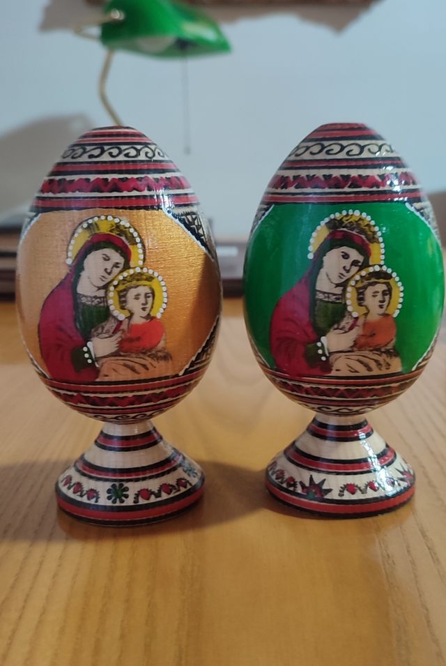 Dettagli del prodottoUovo originale russo, tipico dell'iconografia sacra ortodossa, realizzato artigianalmente in legno e dipinto a mano, altezza 13,5cm. Da collezione. È rimasto solo l'uovo sulla sinistra nelle foto.