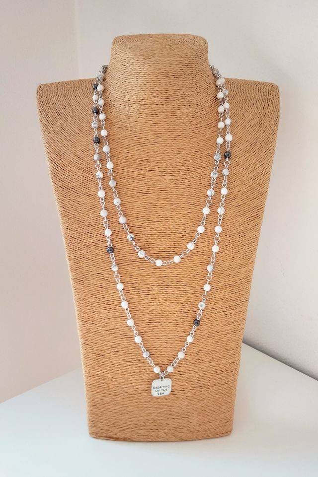 Bellissima collana artigianale molto lunga (circonferenza 130 cm) realizzata a mano con pietra howlite bianca naturale ed ematite da 6mm.